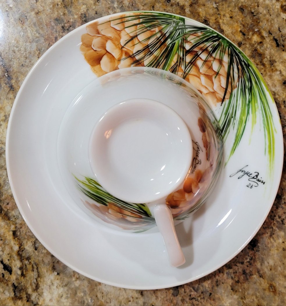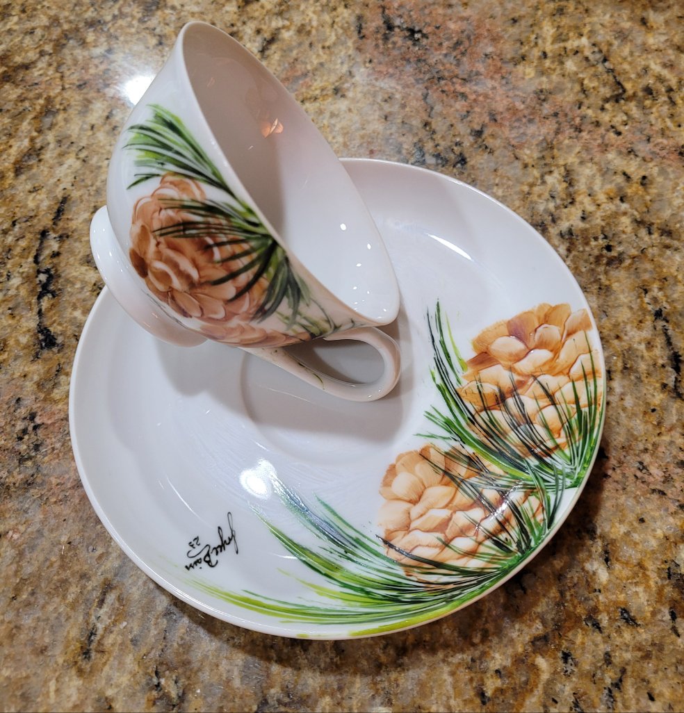Hand Painted tea cup with Pine cones. A perfect gift for the Christmas Season