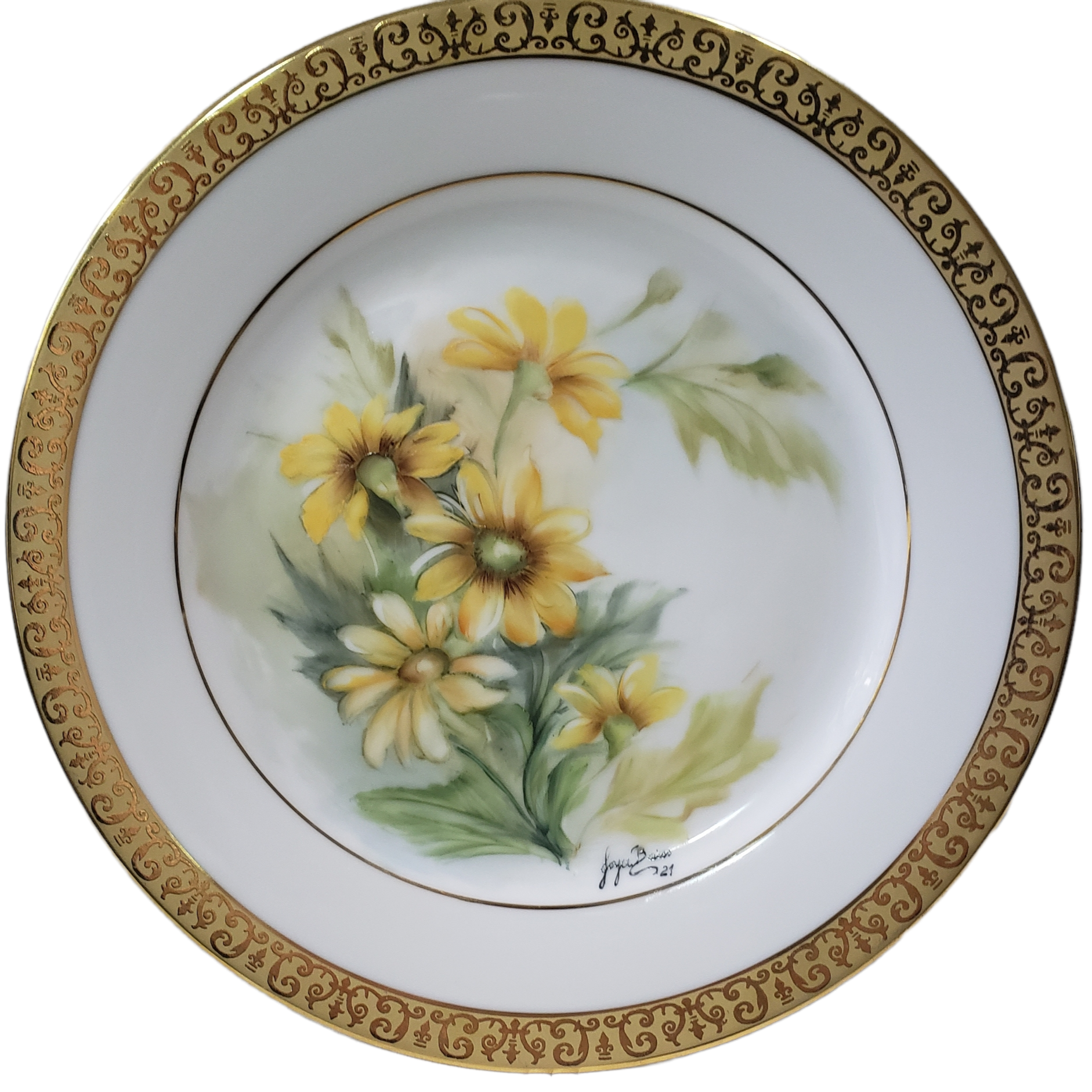 7 inches hand painted dsaisies on a Porcelain Plate with gold rim.